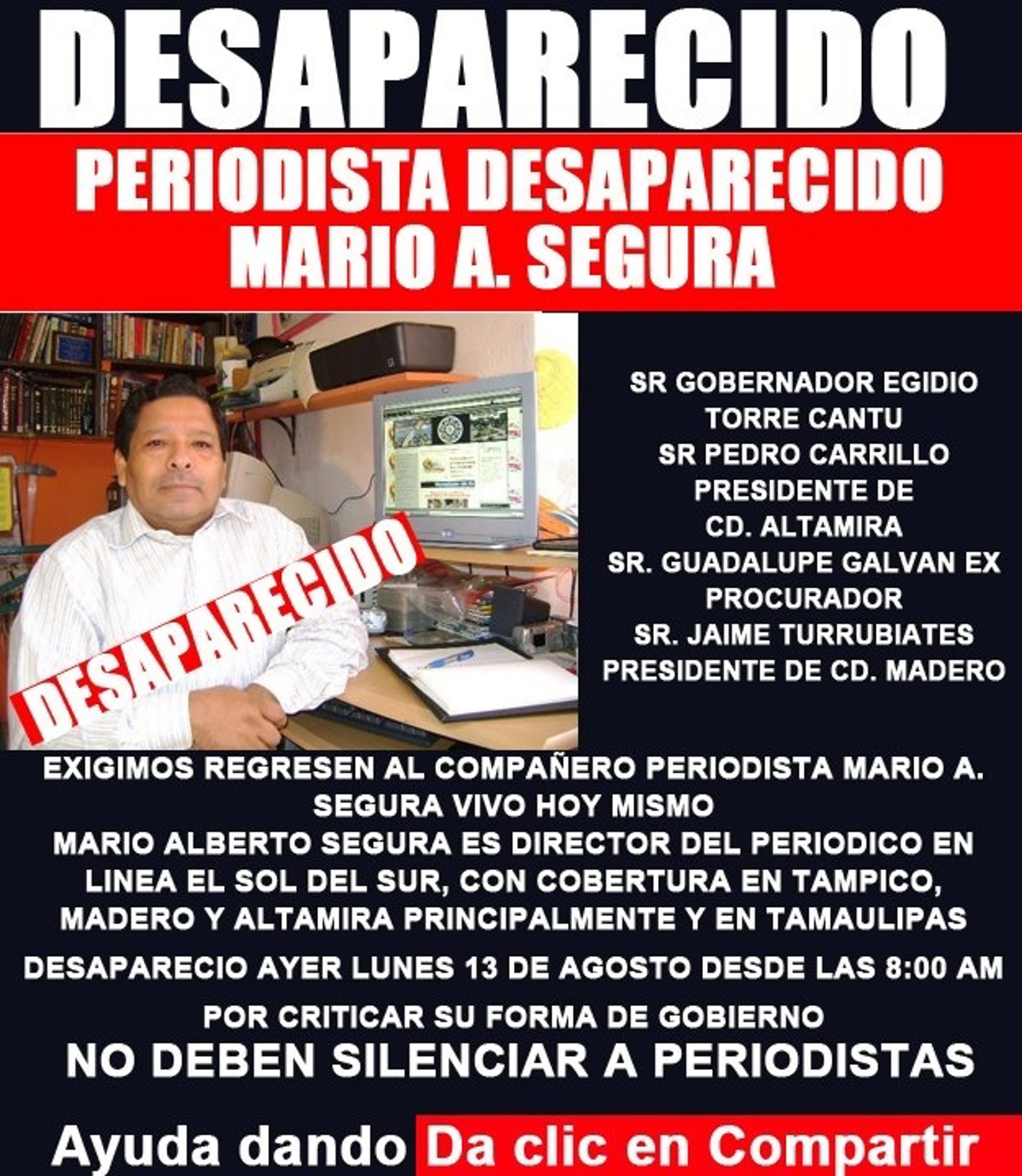 El periodista Mario Segura, director del diario 'El Sol del Sur', con sede en el conflictivo estado mexicano de Tamaulipas (norte), se encuentra desaparecido desde el pasado lunes, 13 de agosto, han denunciado personas allegadas al conocido periodista.
