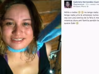 "Adiós a todos. No tengo nada, ya no tengo nada. Julio, te amo. Nunca lo olvides. Me voy con una sonrisa de lo feliz que me hiciste mientras duró. A mí familia perdón les pido. Los quiere Gabi", fue el mensaje que publicó una jóven mexicana junto a una foto en su perfil de Facebook antes de ahorcarse.