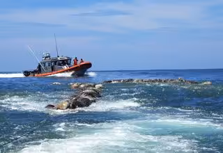 Un barco de la marina mexicana cerca de las alrededor de 300 tortugas muertas