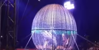 Durante la representación, varios motoristas dan vueltas sincronizadas dentro de una esfera, lo que provoca que si uno de ellos pierde el control y cae, el resto también lo hace, simulando un efecto dominó.