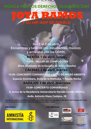 Bajo el título "Música por los DDHH con Jota Ramos y su hip hop de pueblo" este músico y activista colombiano mantendrá encuentros y talleres con estudiantes, músicos y activistas por los derechos humanos.