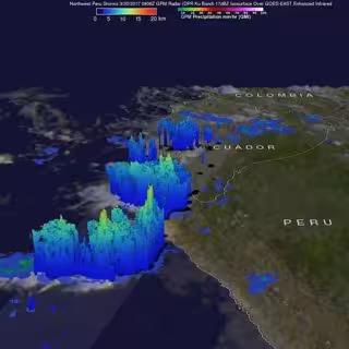 Cuando el satélite central del GPM voló por encima de Perú el 20 de marzo de 2017 a las 0826 UTC, identificó ubicaciones de tormentas que estaban dejando fuertes lluvias sobre el noroeste de Perú. Los datos recolectados por los instrumentos de microondas de la GPM (GMI) y el radar de precipitación de doble frecuencia (DPR) durante este paso revelaron que precipitaciones muy fuertes estaban cayendo en esa área. Los datos del radar de GPM (DPR Ku Band) indicaron que algunas tormentas estaban dejando lluvia a una velocidad extrema superior a 137 mm (5,4 pulgadas) por hora. Estas precipitaciones extremas se encontraron en la línea de tormentas que se extienden hacia el suroeste desde la costa peruana.