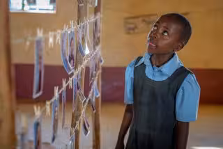 Dentro de un aula con techo de chapa, en la comunidad rural de Mwala, en Kenia, cientos de fotos de futuros padrinos y madrinas colgaban de cuerdas para que los niños las vieran. En esta comunidad de 40.000 personas, la mayoría de las familias viven de la agricultura, pero la sequía amenaza sus cosechas y tienen que caminar más de dos horas para encontrar agua.