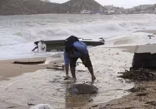 Un hombre ayuda a una tortuga tras huracán Odile en Baja California