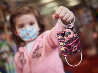 Una niña muestra una mascarilla infantil mientras sale a la calle en Pamplona a finales de abril. - Eduardo Sanz / Europa Press