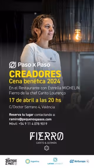 La ONG Paso x Paso organiza una cena benéfica en colaboración con la Chef Carito Loureno el miércoles 17 de abril a las 20 horas en el restaurante con estrella Michelin "Fierro" ubicado en Valencia, con un cupo exclusivo de 16 comensales. Titulada "Creadores", la cena convoca a líderes de empresas que quieran ser parte de proyectos solidarios.