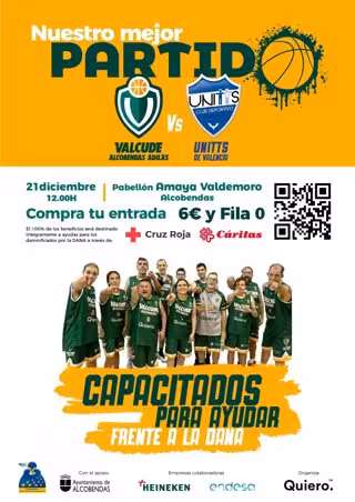 Los equipos de baloncesto formados por jugadores con discapacidad cognitiva Quiero Valcude Alcobendas Adilas y UNITTS CD de Valencia protagonizarán el 21 de diciembre un partido homenaje a favor de los afectados por la DANA.