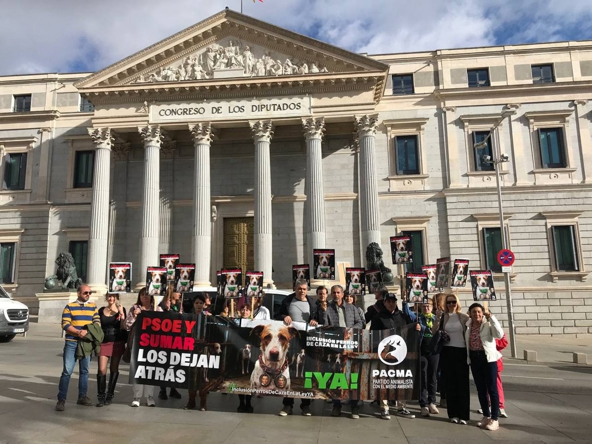 PACMA ha presentado este jueves frente al Congreso de los Diputados su nueva campaña 'PSOE y Sumar los dejan atrás: Inclusión de los perros de caza en la Ley, ¡ya!', con la que exigen al Gobierno la inclusión de estos animales en la Ley de Bienestar Animal.