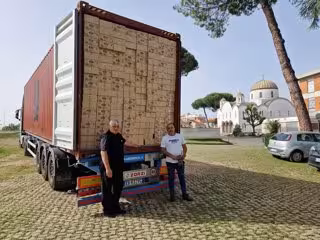 La oficina de prensa del Vaticano ha difundido a la prensa las imágenes del purpurado junto a dos camiones con el material sanitario.