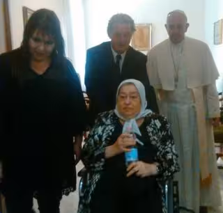 Como obsequio, la líder argentina entregó al Papa el simbólico pañuelo blanco que representa la lucha que Madres lleva desde hace casi 40 años por la recuperación de sus hijos desaparecidos por la dictadura".