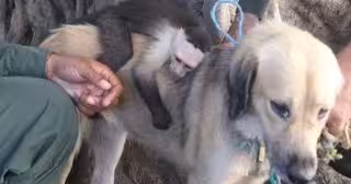 La perra incorporó a la cría de primate a su camada de cachorros. El pequeño simio se adaptó rápidamente a la familia adoptiva y gracias a esta perrita, que no tuvo dificultades para criarlo, sobrevivió de una muerte segura.