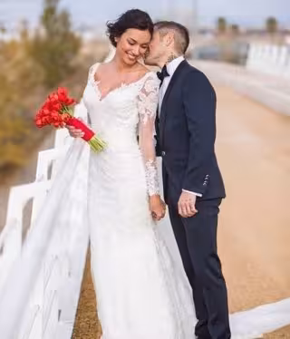 Para este día tan especial, la novia eligió un traje de encaje con corte de sirena y un escote pronunciado, además de un original ramo de tulipanes rojos. Por su parte el novio se decantó por un smoking azul marino. Los novios estuvieron acompañados por sus familiares y amigos más cercanos por lo que no se vieron apenas caras conocidas.
