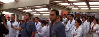 Personal médico y de enfermería protesta a estas horas a las afueras del Hospital del Seguro Social de San Cristóbal, en Táchira (Venezuela) por la detención de dos médicos residentes que la noche del jueves atendieron a un joven herido.