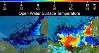 Un equipo de investigación dirigido por Son Nghiem del Laboratorio de Propulsión a Chorro de la NASA en Pasadena, California, usó datos de los satélites para medir la temperatura de la superficie de las aguas que vierten en un río de Canadá en el hielo del mar de Beaufort en el verano de 2012.