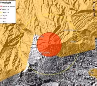 Contempla una zona de alto o máximo peligro definida por el área de dos kilómetros alrededor del cráter suroeste, con caída de ceniza vulcaniana de un milímetro de espesor y flujos piroclásticos (mezcla de gases volcánicos calientes, materiales sólidos y aire atrapado) por colapso de columnas estrombolianas (erupciones explosivas).