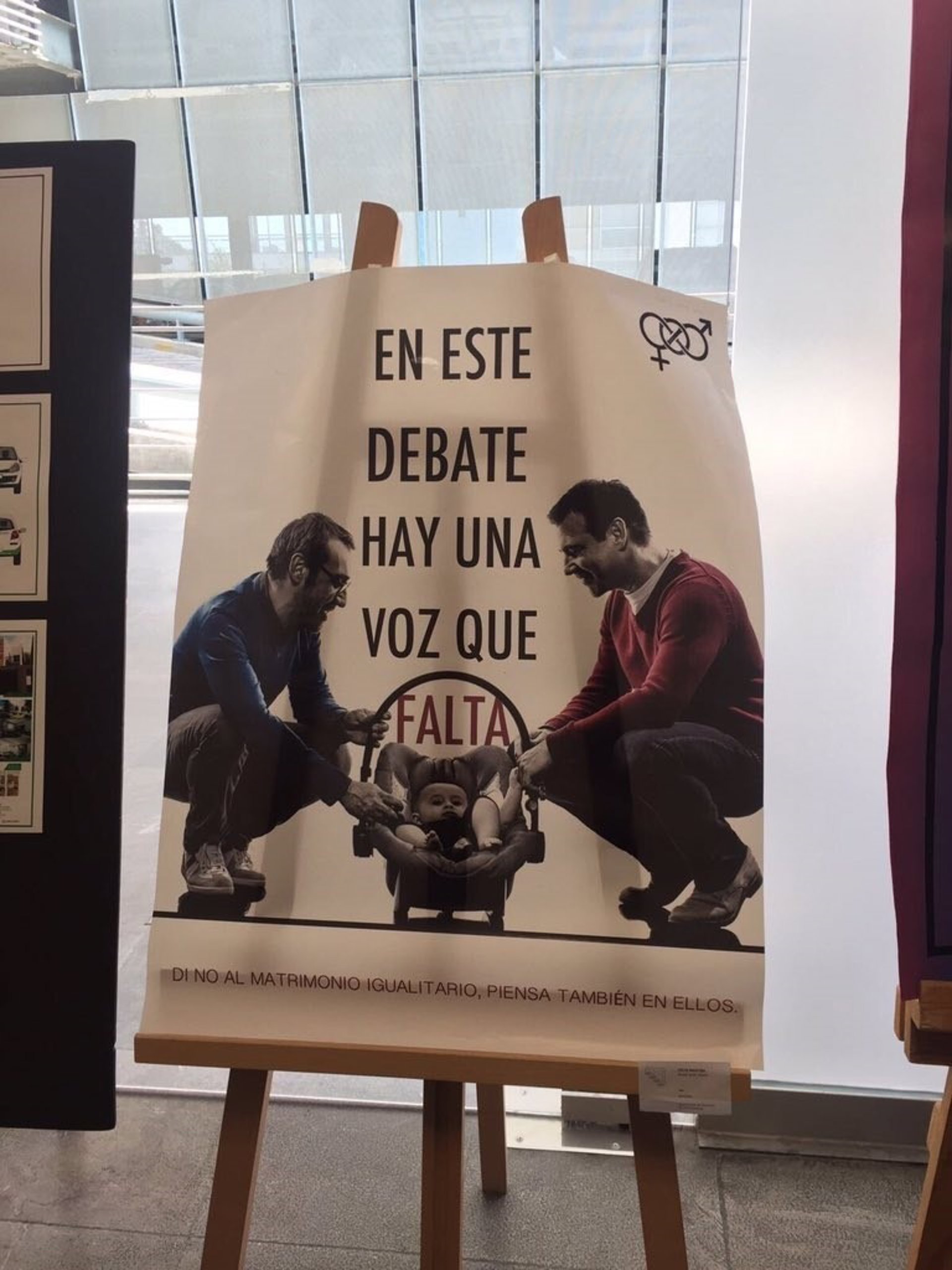 "En este debate hay una voz que falta. Di no al matrimonio igualitario. Piensa también en ellos", rezaba un póster acompañado de la imagen de dos hombres con un bebé en una sillita.