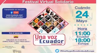 Una veintena de músicos ecuatorianos residentes en España, Francia, Italia, Países Bajos y Suiza participan este domingo en el Festival Virtual Solidario 'Una voz por Ecuador desde Europa', cuyos beneficios serán destinados a los más afectados económicamente por el impacto del coronavirus en el país.