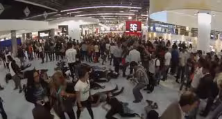 Unas 50 personas han dado vida a un flasmob en pleno pabellón de la Feria del Libro de Guadalajara (FIL), México, para exigir justicia por los 43 estudiantes de Ayotzinapa desaparecidos en Iguala el pasado mes de septiembre.