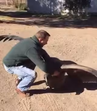 El ave de Neuquén, Argentina, aparece en el vídeo abriendo sus grandes alas y caminando hacia el hombre que le salvó como gesto de gratitud. El animal se encuentra con él y de manera muy cariñosa se "abrazan" durante varios segundos.