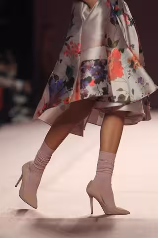Para los pies, Juan Vidal propone botines de colores rosados como la de sus prendas y medias que aparecen en el tobillo. Para el pelo un moño desestructurado, con un aire de quién acaba de levantarse, acompañado de un maquillaje que es casi inexistente.