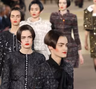 En un desfile lleno de colores fríos, neutros y algún que otro vestido de color rojo han destacado las chaquetas toreras y las faldas de lápiz cuya altura queda ligeramente por encima de la rodilla para reinventar el icónico traje de Coco Chanel.