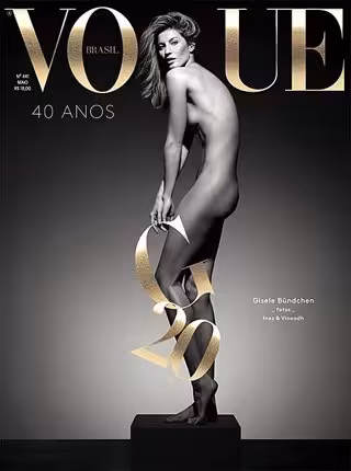 La portada en blanco y negro del número de mayo de la mítica revista está centrada únicamente en la imagen desnuda de la modelo, que aparece de pie sobre un pedestal, cual diosa griega, y sostiene en sus manos la letra 'G', de Vogue y de Gisele, y el número 20, las dos décadas en las pasarelas.