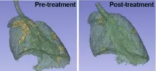 Imagen del pulmón de ratón con focos tumorales (en amarillo), antes y después del tratamiento.