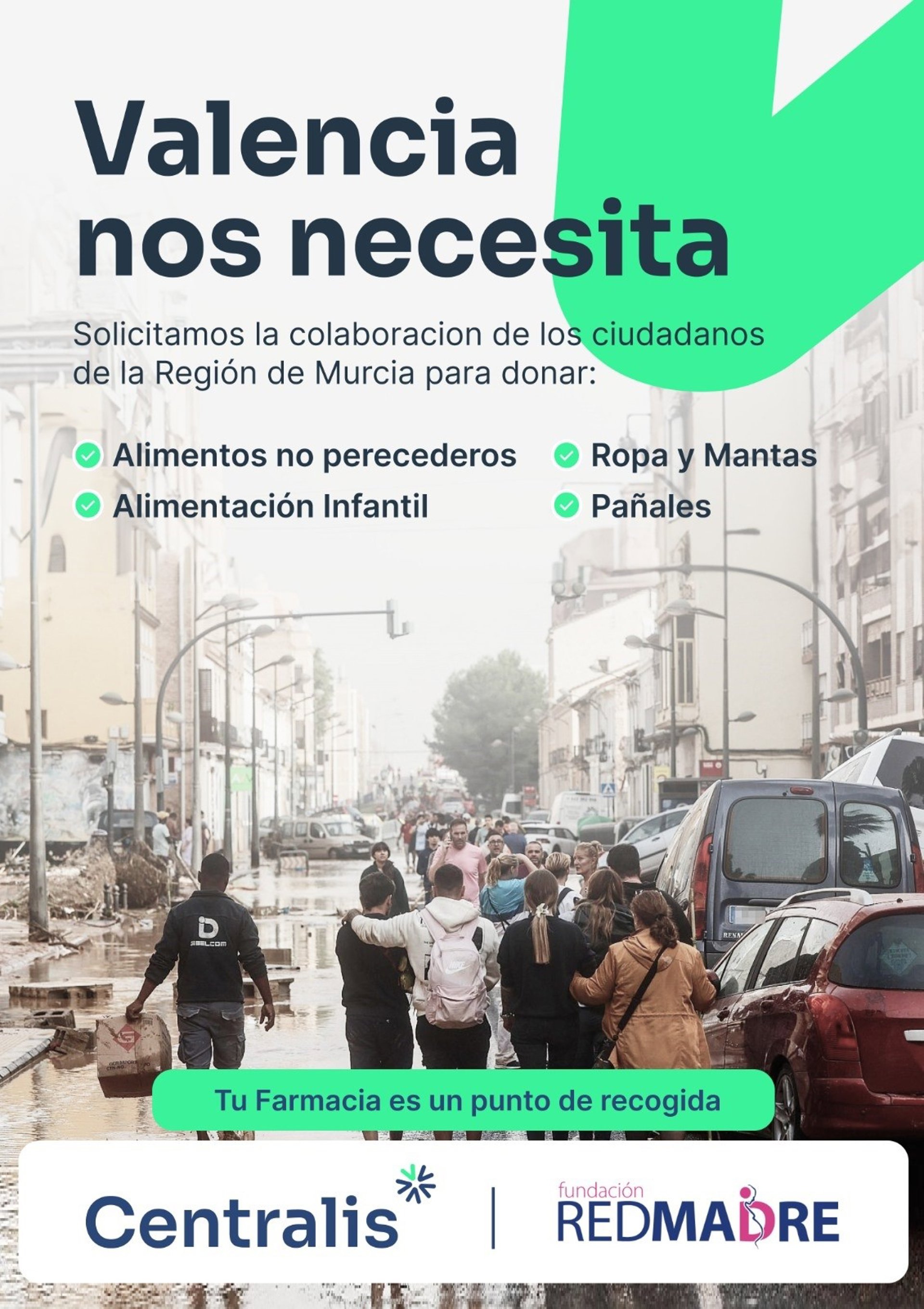Centralis Farma ha lanzado una campaña de recogida solidaria de productos básicos en sus farmacias situadas en la Región de Murcia y Castilla-La Mancha para ayudar a las personas afectadas por el temporal provocado por la DANA en la Comunidad Valenciana y municipios manchegos.