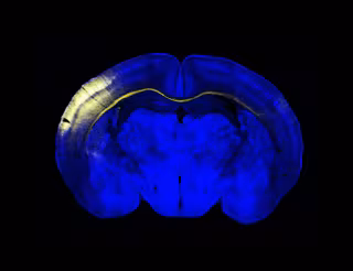Archivo - Sección horizontal del cerebro del ratón. Un grupo de neuronas de la corteza iluminadas en amarillo extienden sus axones a través del cuerpo calloso para conectar con el hemisferio contralateral. - CNB/ CSIC - Archivo