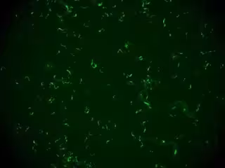 Grupo de 'C. Elegans' infectados visualizados con una lupa. La fluorescencia verde corresponde con las células infectadas y permite distinguir animales infectados de sanos.