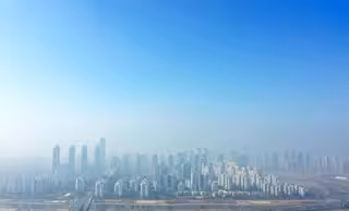 11 March 2025, South Korea, Incheon: The international business district of Songdo in Incheon is shrouded in haze as PM2.5 levels, referring to harmful particles smaller than 2.5 microns in diameter, are forecast to remain "bad" in the region. The governm