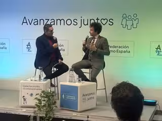 Alberto Fernández Parrón (izquierda), periodista y conductor de la jornada, conversa con Guillermo Benito Ruiz, psicólogo del área de Investigación de Autismo España. - CONFEDERACIÓN AUTISMO ESPAÑA