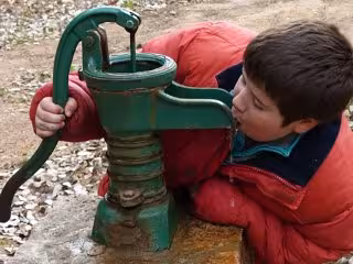 Niño bebe agua de una fuente.