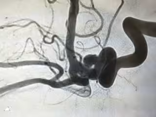 Imágenes de la intervención, obtenidas mediante angiografía con substracción digital donde se evidencia el antes y después del aneurisma cerebral tratado, totalmente ocluido tras la introducción del nuevo dispostivo.