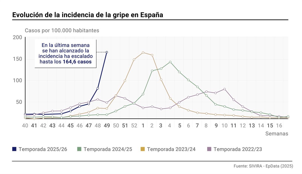 La tasa de síndrome gripal se sitúa en 164,6 casos por cada 100.000 habitantes y ha superado el pico alcanzado las tres últimas temporadas, que fue de 141,3 casos por 100.000 habitantes en la temporada 2024-2025, de 163,7 en 2023-2024 y de 76,6 casos en 2022-2023, según muestra el último informe del Sistema de Vigilancia de Infección Respiratoria Aguda (SiVIRA), publicado este jueves por el Instituto de Salud Carlos III (ISCIII).